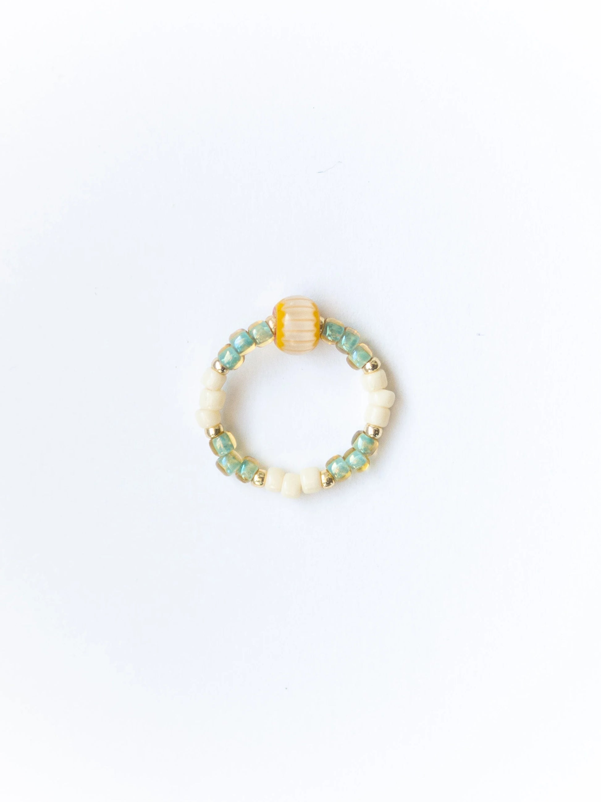 The Honeydrop Ring is made from soft sage and white beads, arranged in little trios and broken up by small golden accents. At the center sits a one-of-a-kind vintage glass bead in a warm red–yellow marble.
