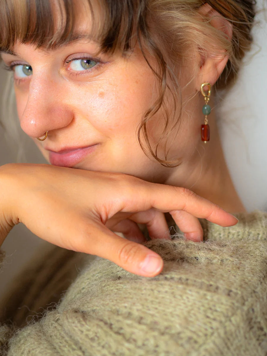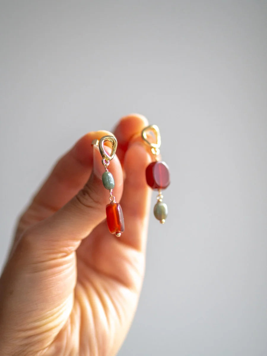 These earrings combine organic gold studs with deep red vintage beads and green natural stone beads. A simple combination that remains interesting through its asymmetrical arrangement.