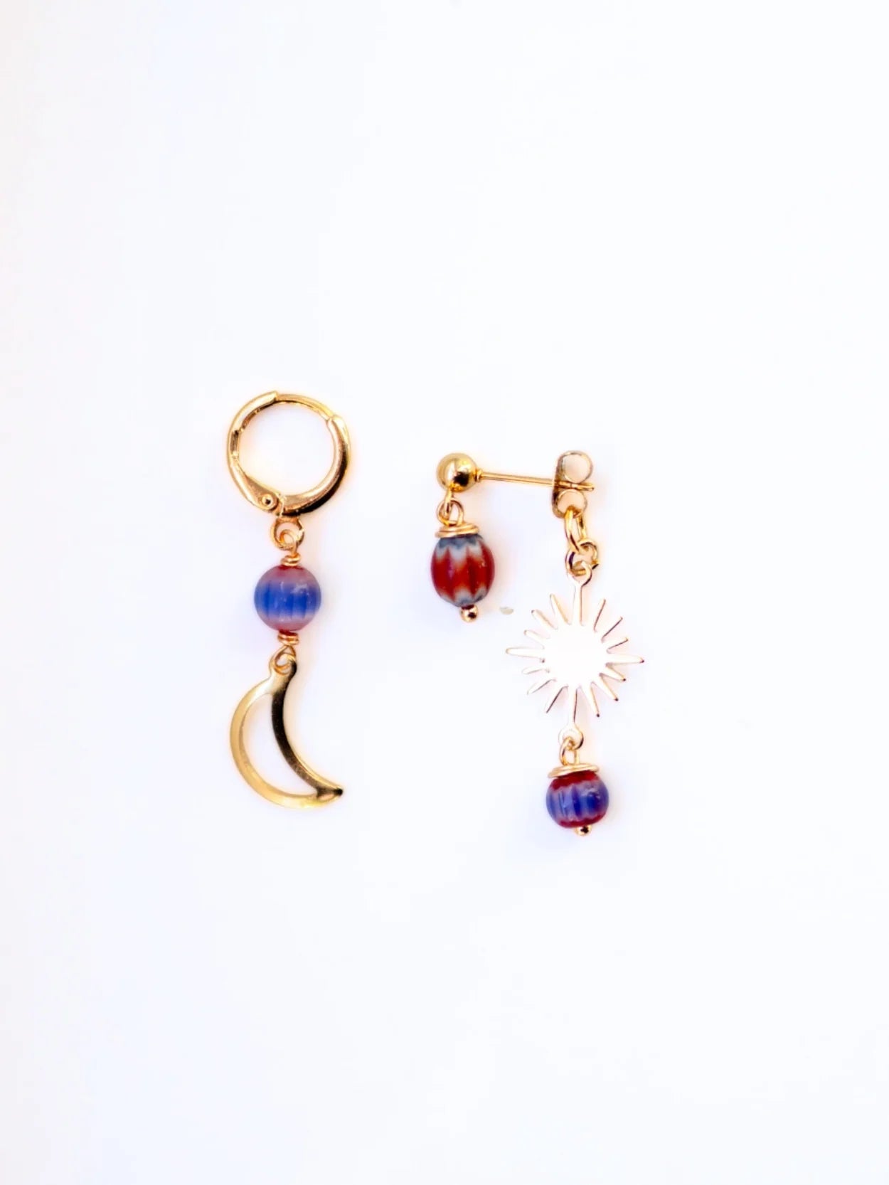 One side of this pair holds the warmth of the golden sun, the other the calm of the moon. Connected by vintage red and blue glass beads.