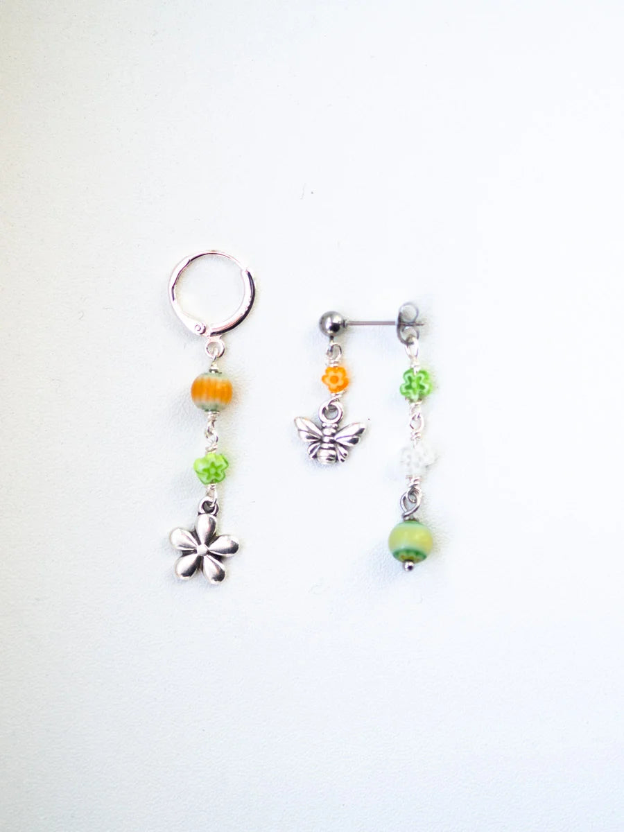 Yes, I love asymmetrical earrings. This pair combines small flower beads, upcycled vintage glass beads and stainless steal charms in a pair that reminds me of wildflower meadows and grown-out lawns.